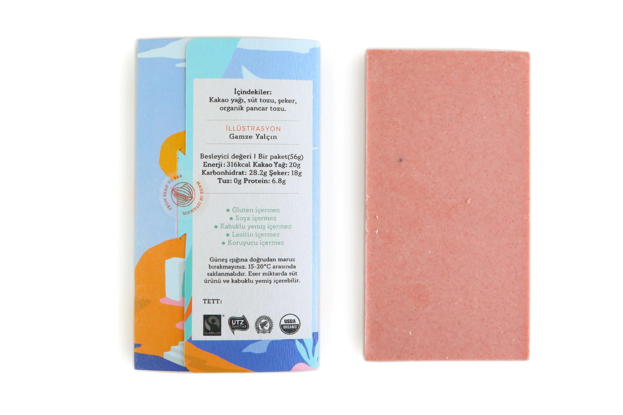 İçindekiler: Kakao yağı, süt tozu, şeker, organik pancar tozu